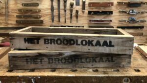 Voor het Het Broodlokaal in Zeist hebben wij twee douglas terrasbanken van 240 cm lang mogen maken. Van de logo’s op de oude banken zijn twee kistjes gemaakt.