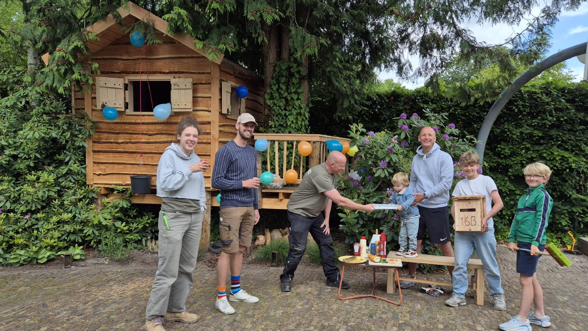 Tijdens de officiële boomhut opening hebben Siem en Bob een bankje in elkaar gezet, kregen de jongens een brievenbus, een naambord op de deur en een boomhut bezem. Na het doorknippen van het lint was de boomhut officieel geopend en hebben wij geproost met kinderchampagne.