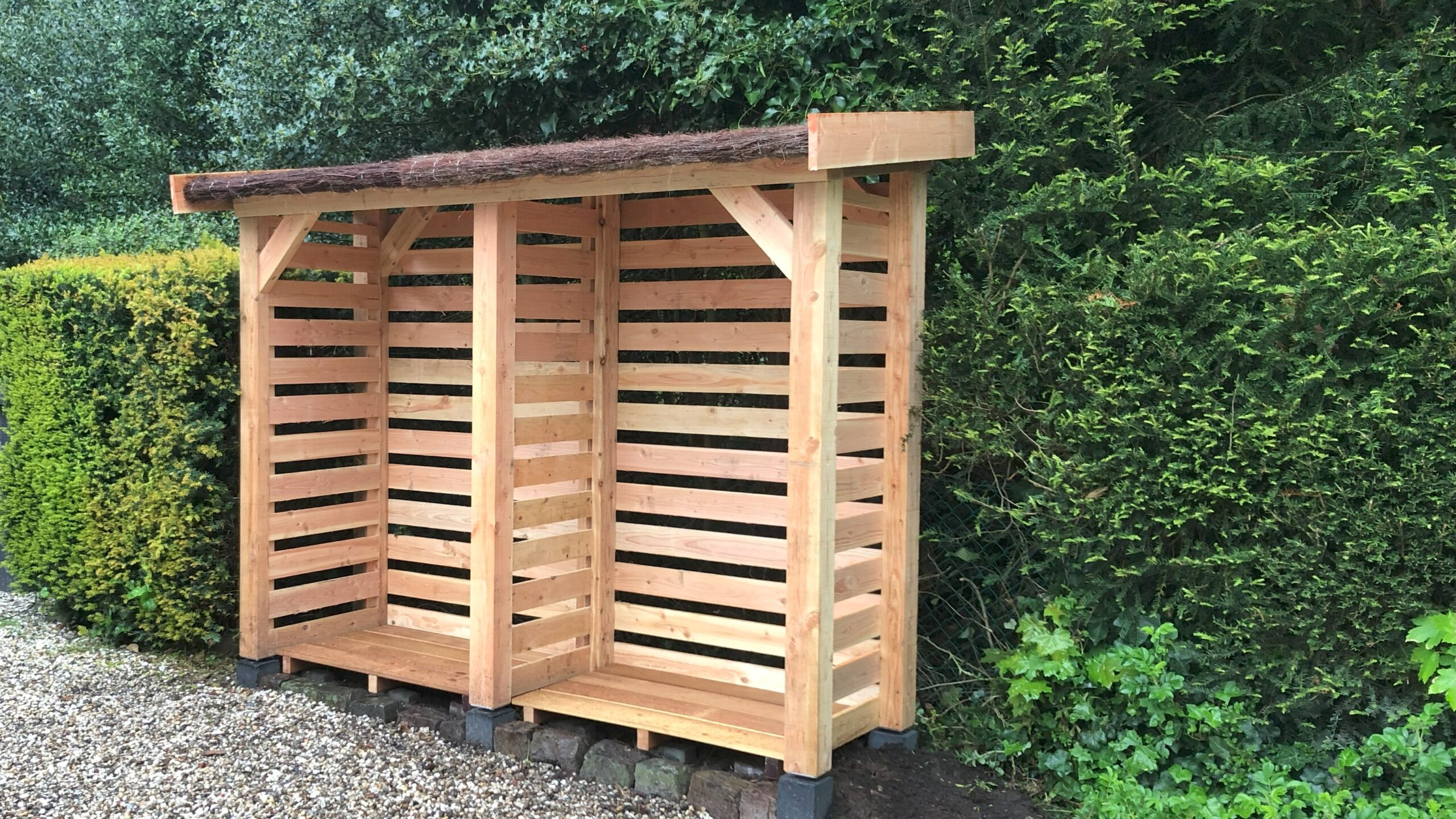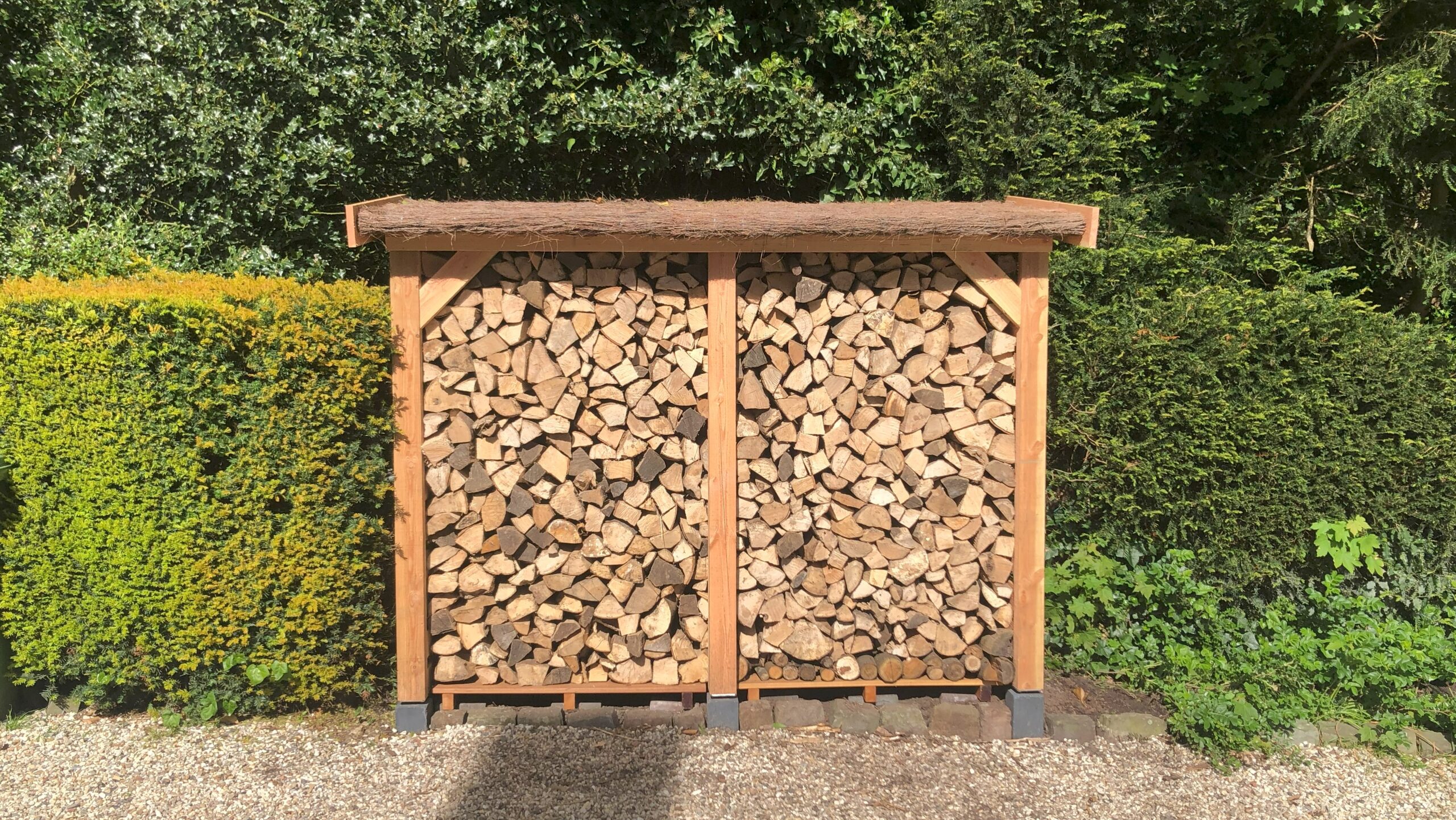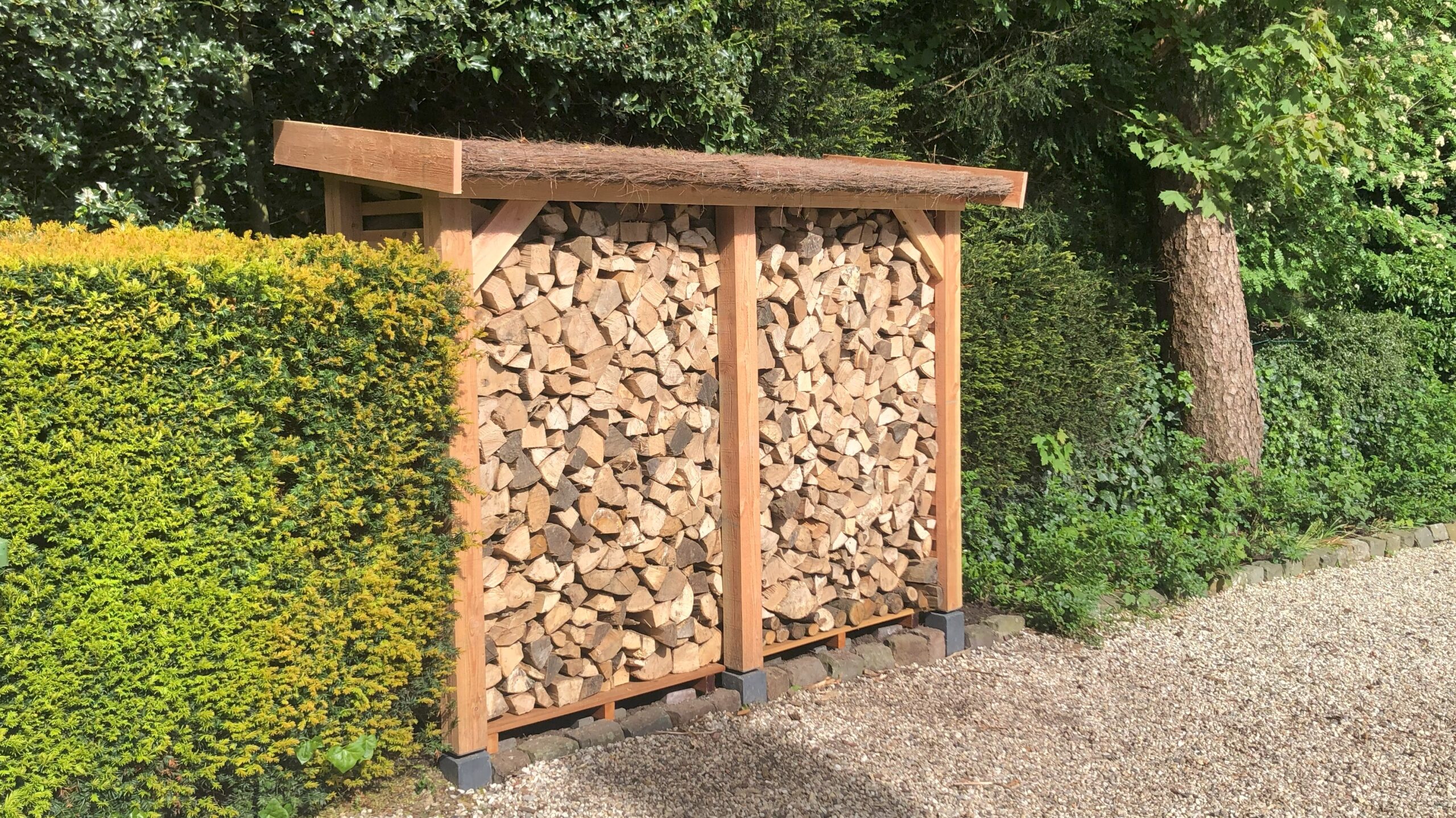 Deze douglas houtopslag staat op betonpoeren. Het houten dak is waterdicht beplakt met epdm en afgewerkt met heidematten. Er past zo’n 3m3 tot 4m3 haardhout (los gestort) in het houthok.