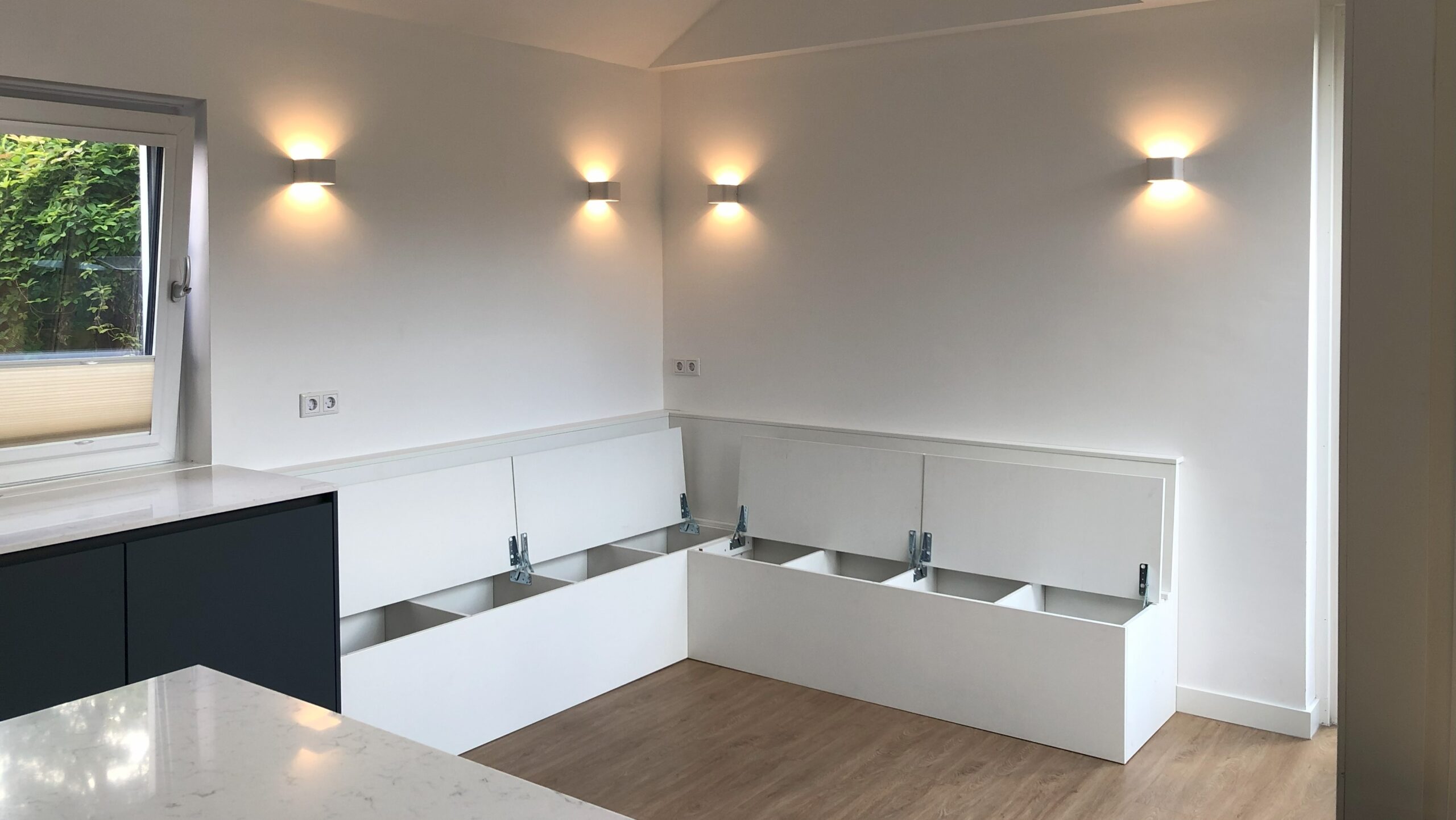 Deze eetkamerbank heeft opbergruimte onder de klep zittingen. De hoekbank is op maat gemaakt van 18 mm dik gegrond mdf.